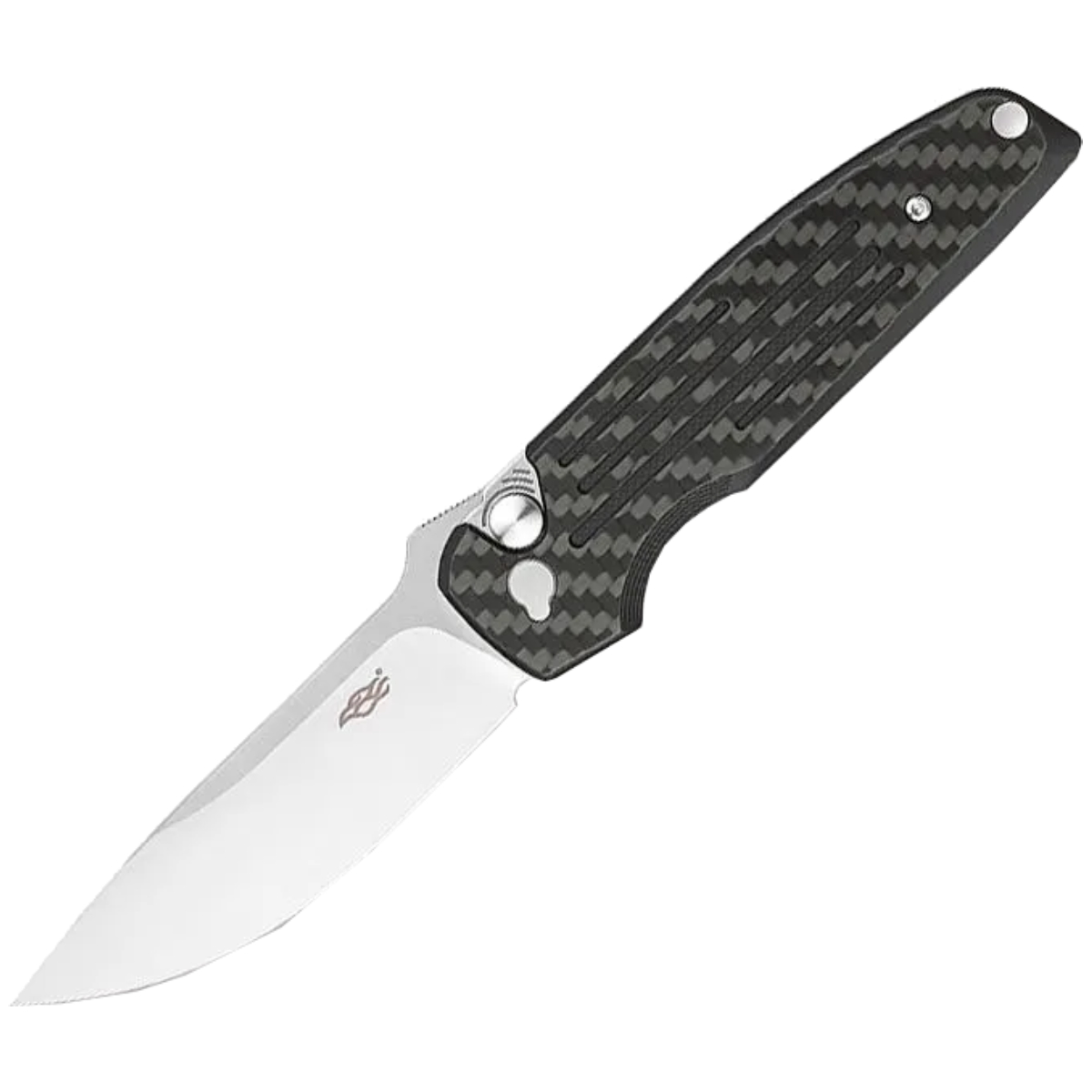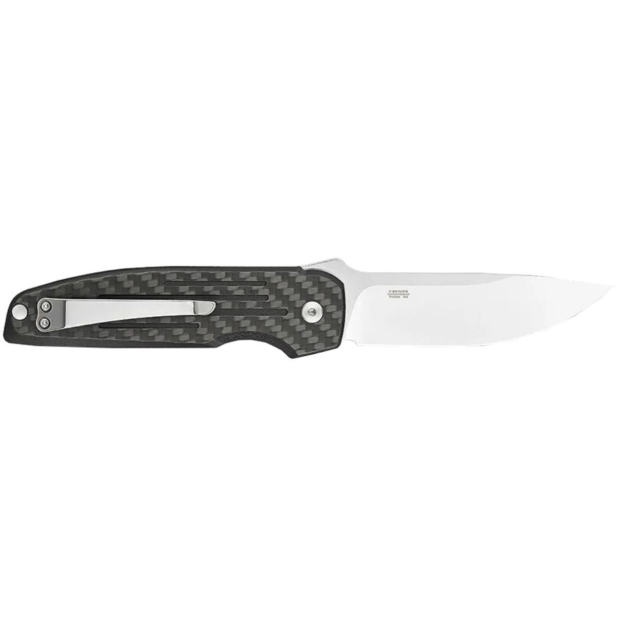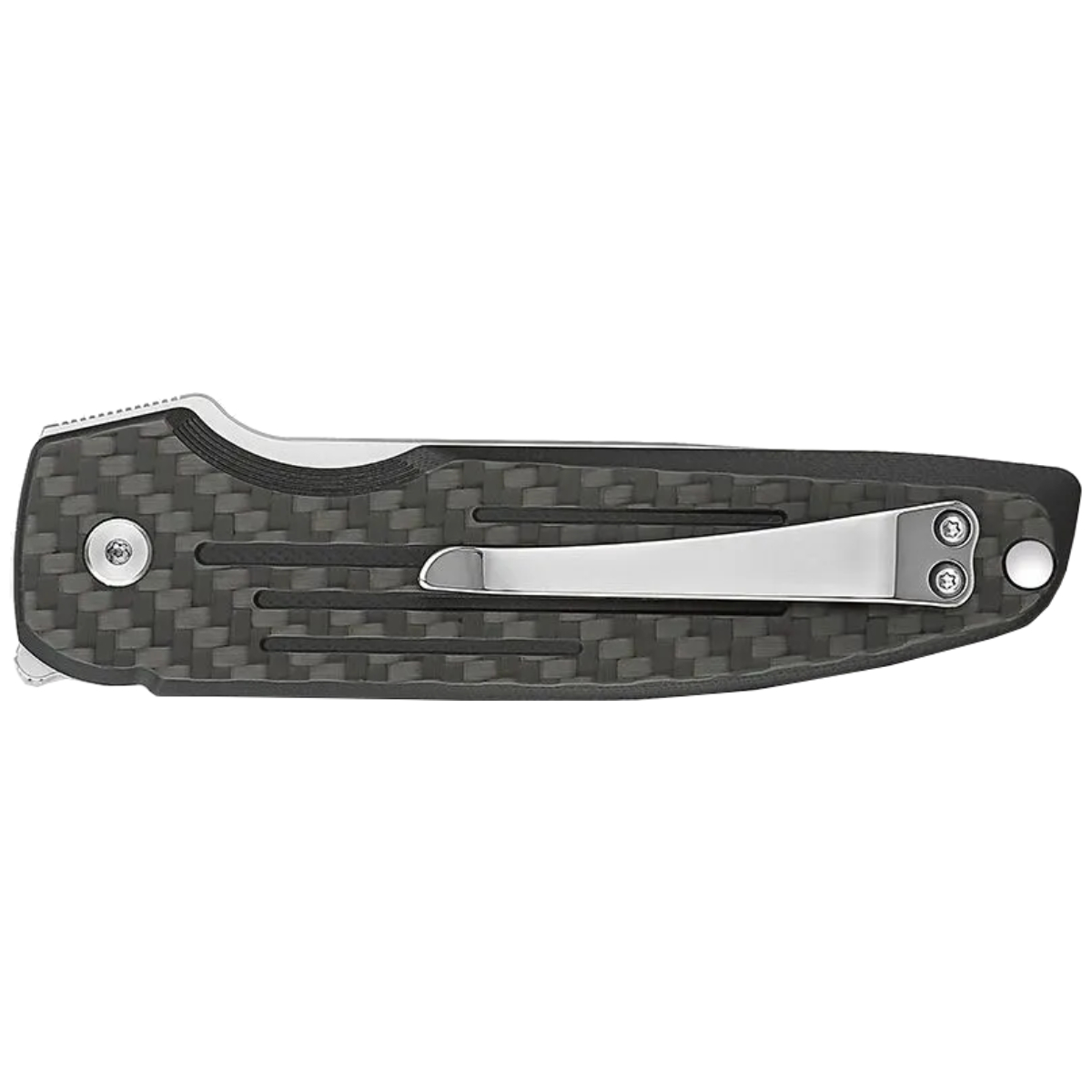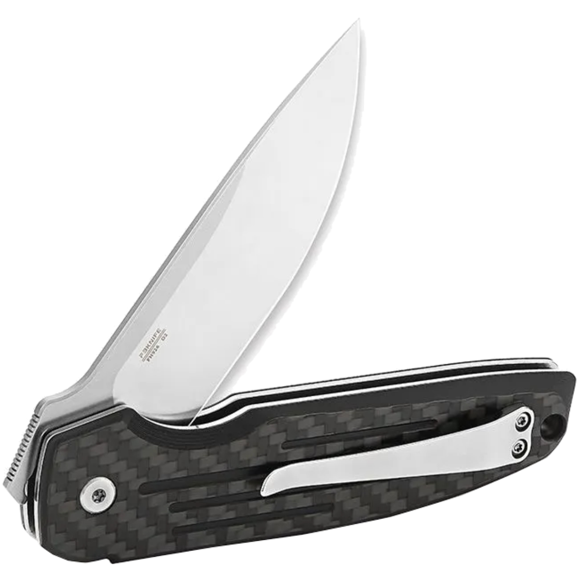 Клинок изготовлен из стали D2 с твёрдостью около 60 HRC — прочный, износостойкий, сохраняет остроту и устойчив к коррозии. Рукоятка выполнена из карбона — прочного, лёгкого материала, устойчивого к вибрациям, влаге и запахам. Текстурированная поверхность и выемка под палец обеспечивают надёжный хват.