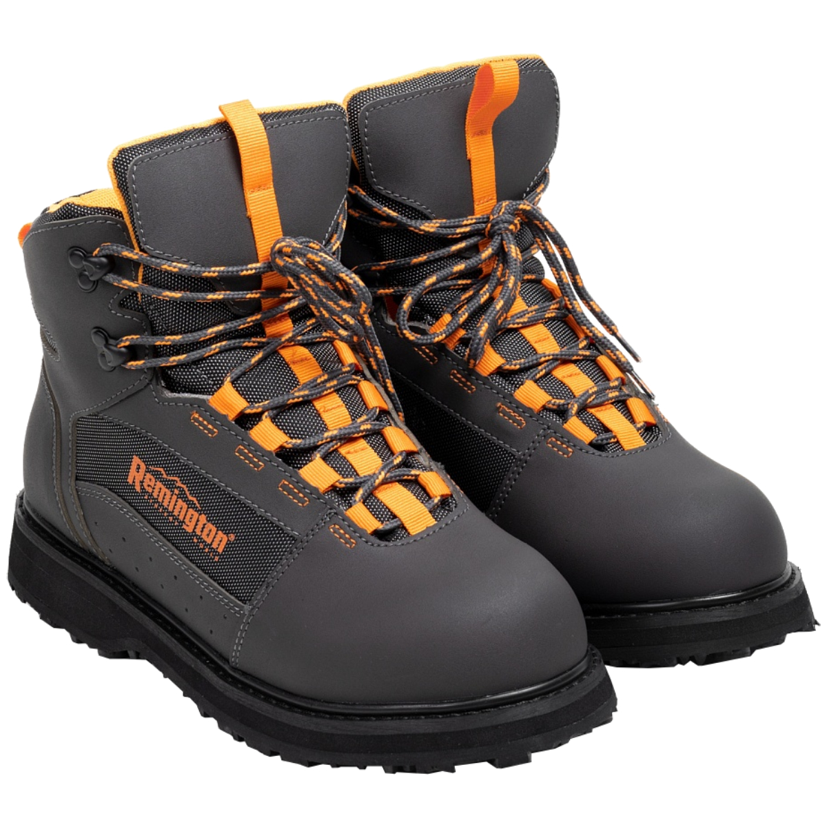 Ботинки выполнены из прочной синтетической кожи, оснащены сливными отверстиями и усиленными зонами в области носка и пятки для защиты и долговечности. Фирменные оранжевые элементы и логотип Remington придают стильный акцент.