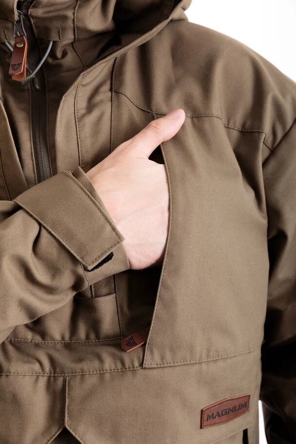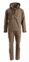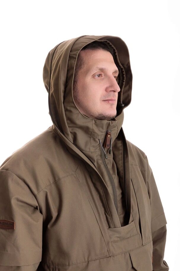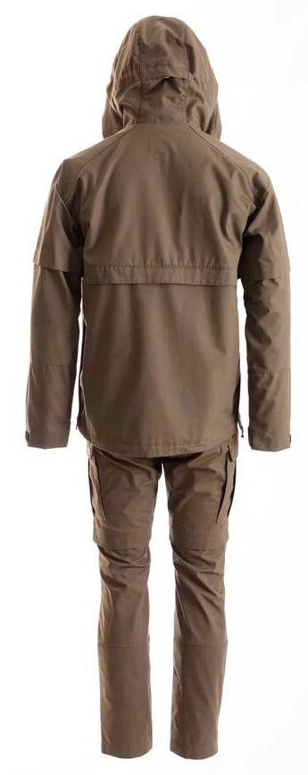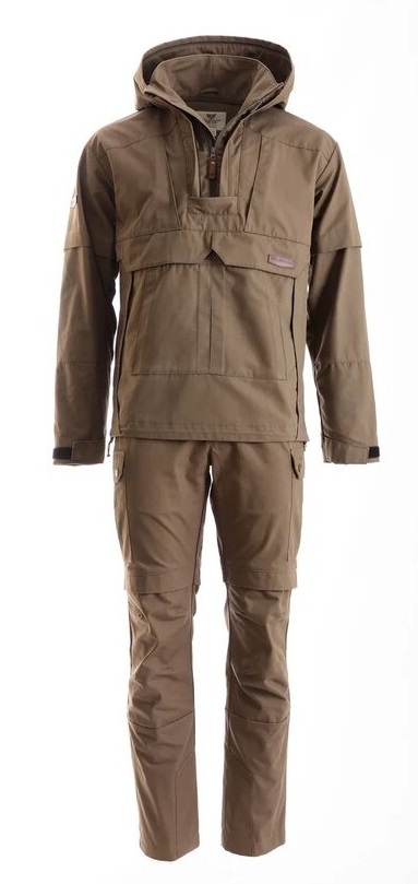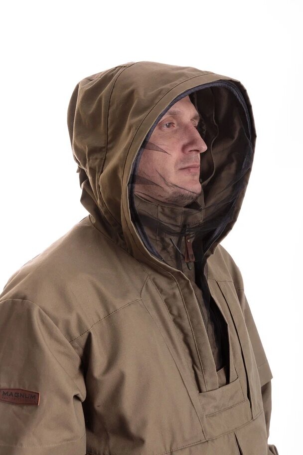 Большое количество функциональных карманов позволит разместить все необходимое для бушкрафта. По бокам куртки расположены раздвижки на двухзамковой молнии, которые упрощают процесс надевания и также могут выступать в качестве вентиляции при активном движении. Капюшон-трансформер с полностью съемной москитной сеткой. Плотные внутренние манжеты. Складки-ловушки на куртке и брюках.