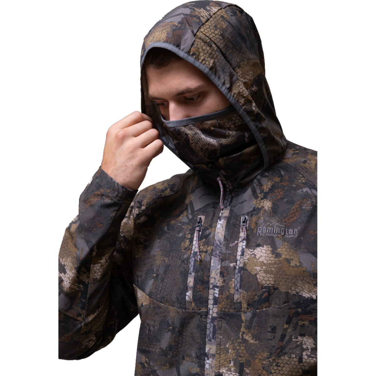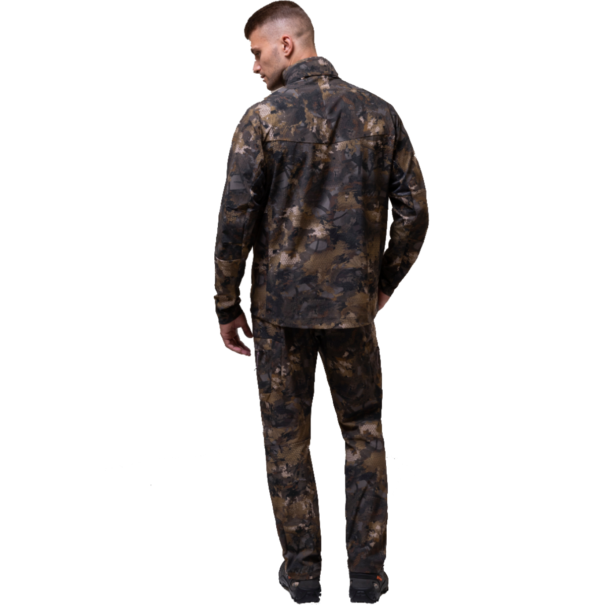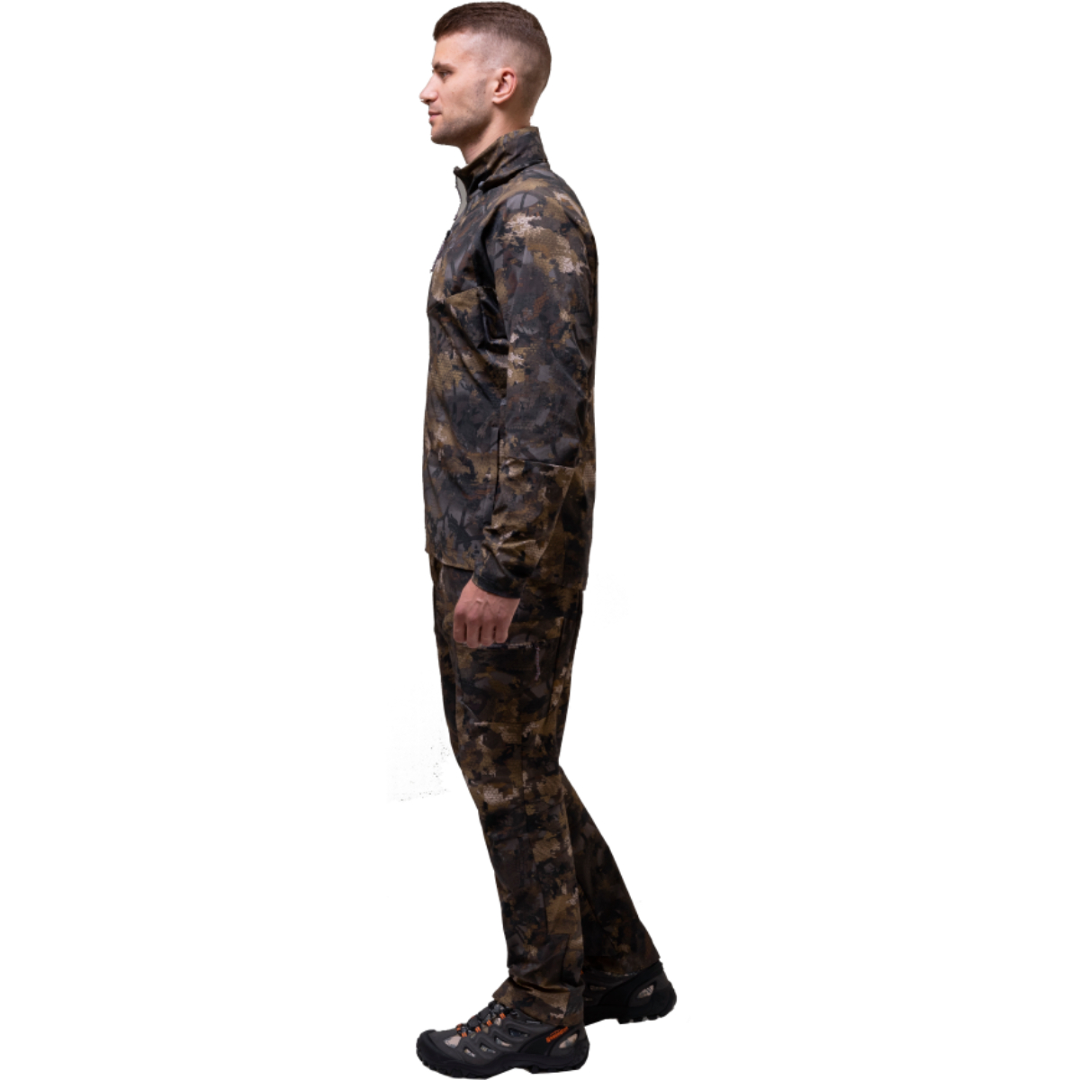 Сетчатые вставки в области подмышек улучшают вентиляцию, анатомический крой брюк и регулировки по объему обеспечивают свободу движений. На коленях предусмотрены карманы под защитные вставки. Встроенный капюшон с маскировочной маской защищает от осадков и помогает быстро адаптироваться к условиям.