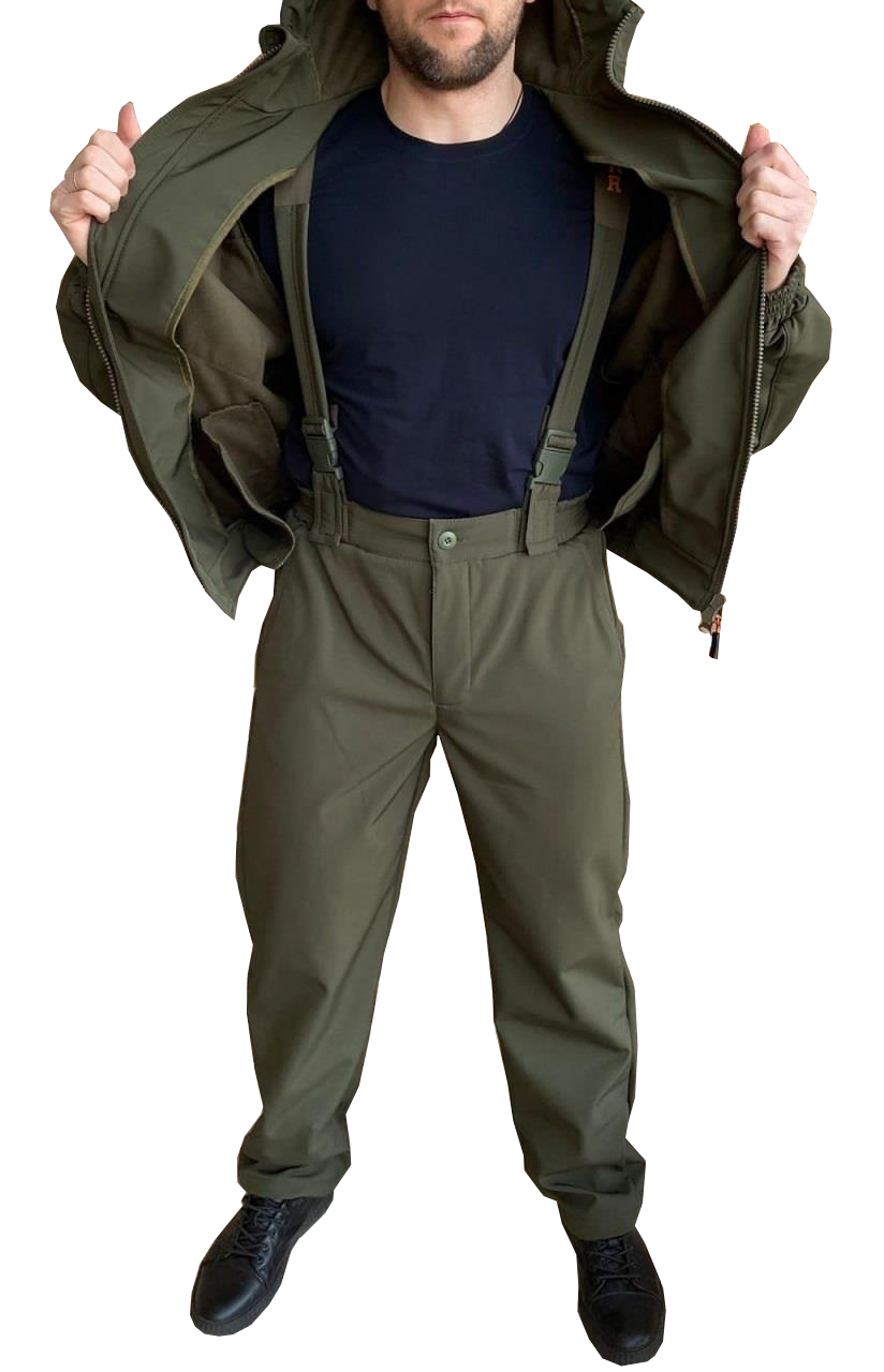 Комплект состоит из куртки на молнии и брюк-полукомбинезона с подтяжками. На куртке 4 кармана (2 боковых и 2 нагрудных), капюшон регулируется по объему и овалу лица. На брюках 2 шлевки под ремень и 2 кармана, подтяжки регулируются и отстегиваются. Низ брючин можно затянуть с помощью эластичного шнура.