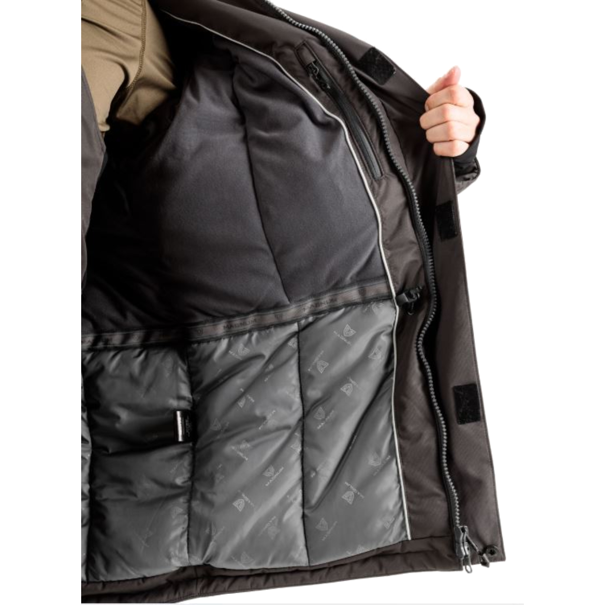 Куртка оснащена центральной застёжкой на молнии с двойным ветрозащитным клапаном, регулируемым капюшоном и внутренним поясом для фиксации по талии. В конструкции предусмотрено множество карманов: четыре накладных, пять прорезных и один внутренний, что обеспечивает удобное размещение необходимых мелочей. Дополнительный комфорт и защиту обеспечивают влагозащитные манжеты из материала Triplex.