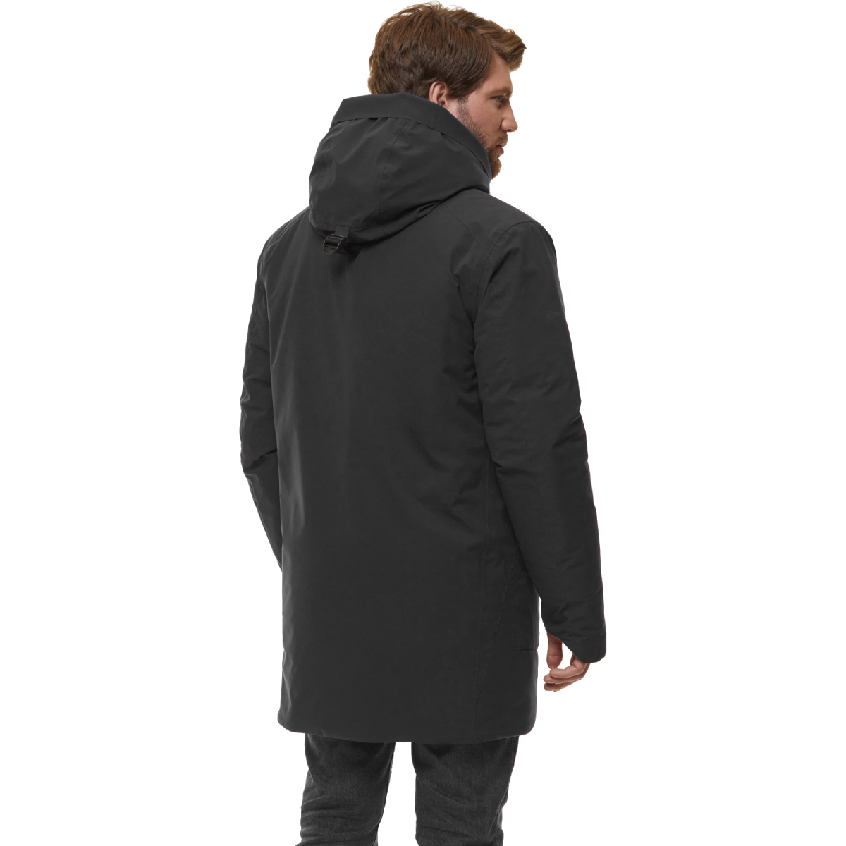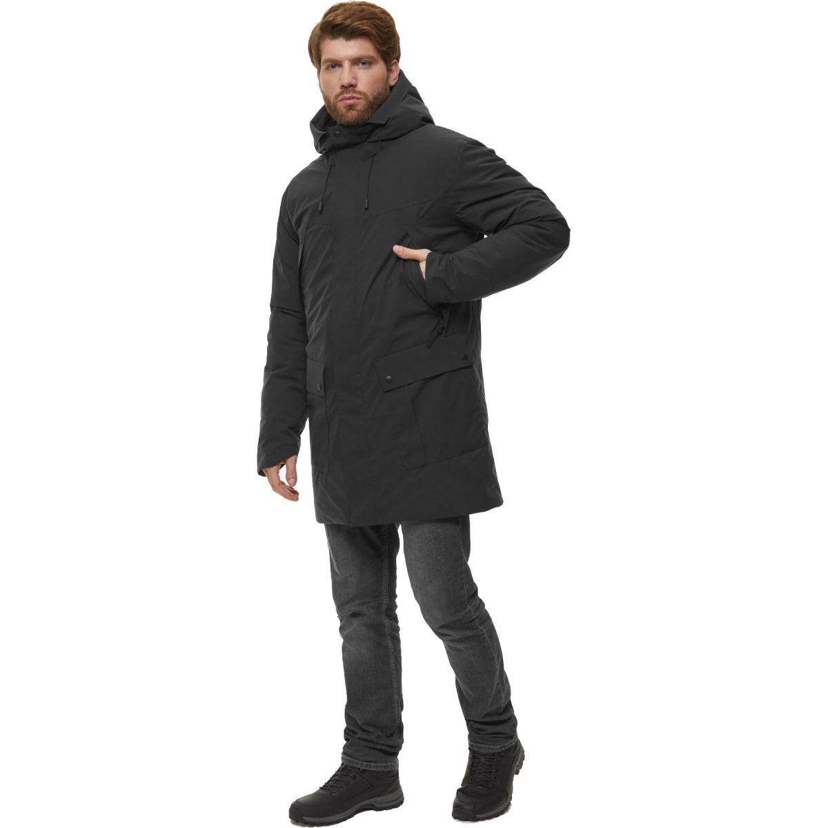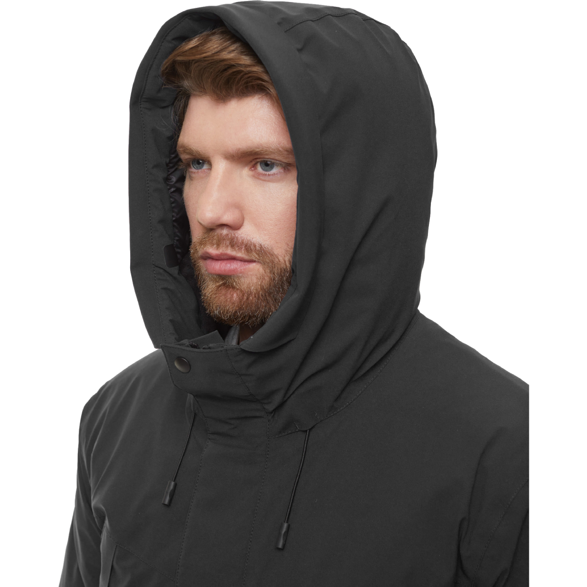 - Большой капюшон с ламинированным козырьком-тубусом защищает от ветра и осадков, регулируется в двух направлениях;