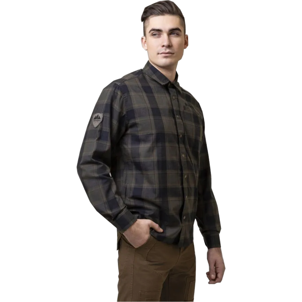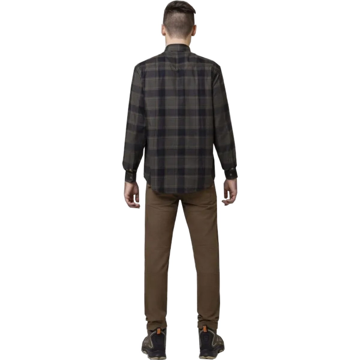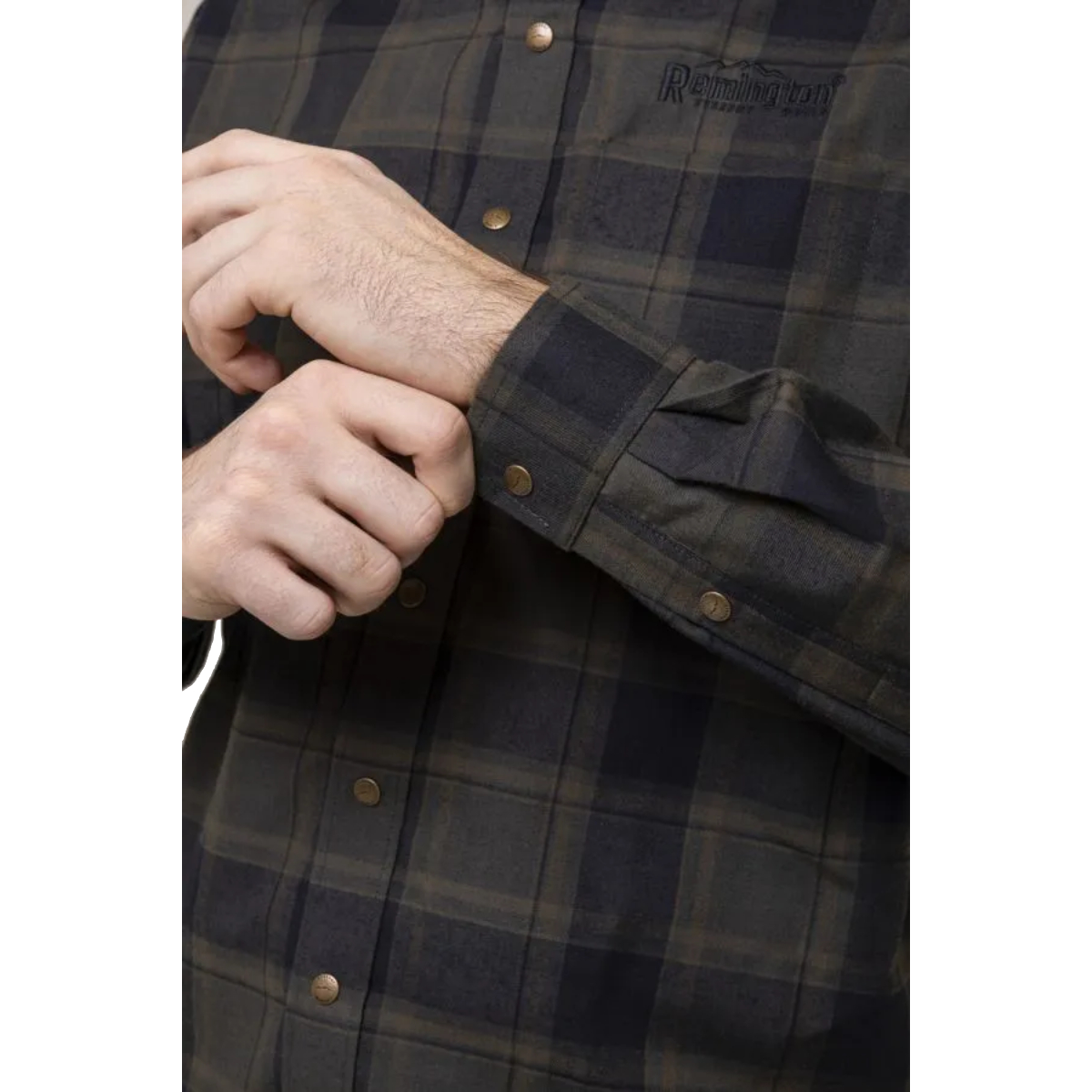 Классическая клетка в коричнево-бежевой гамме органично вписывается в природный ландшафт, делая силуэт менее заметным на фоне деревьев, сухой травы или осенней листвы. Рубашку можно носить как самостоятельный элемент одежды или как второй слой поверх футболки или термобелья, сочетая с другими предметами гардероба.