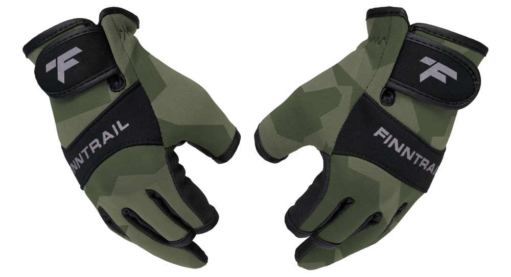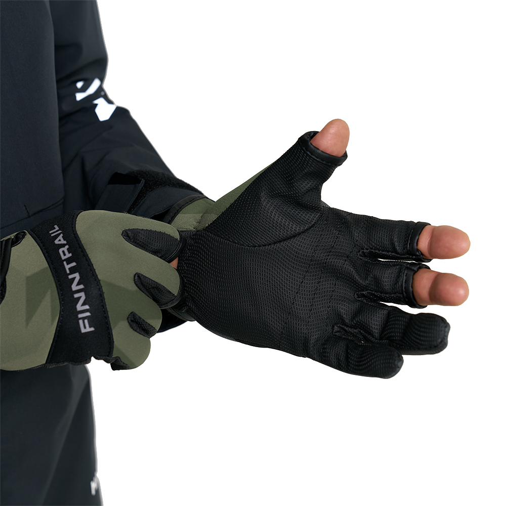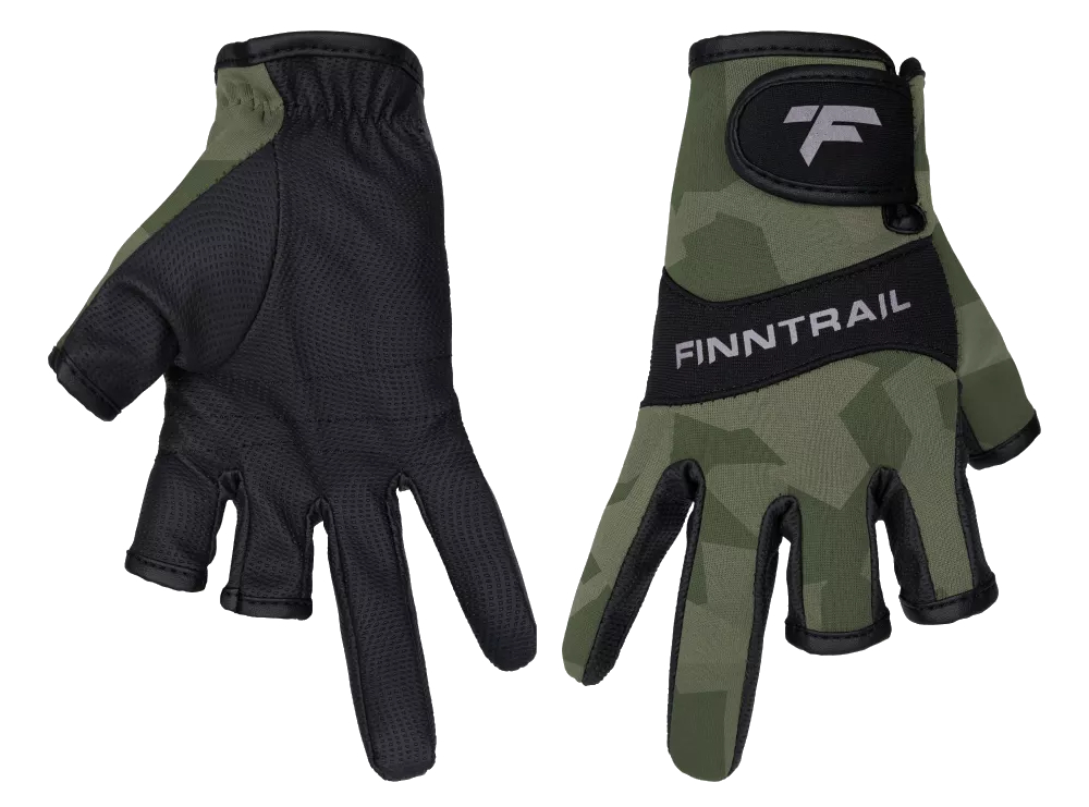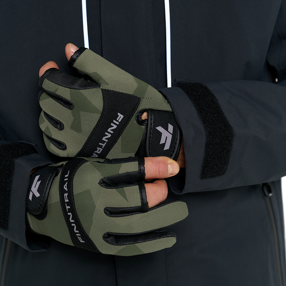 Функциональный дизайн модели объединяет в себе продуманные детали и оригинальную камуфляжную расцветку. Благодаря трём открытым пальцам, сохраняется чувствительность и моторика, что позволяет легко и точно выполнять различные действия со снастями. Застежки на липучках в районе запястья обеспечивают комфортную и надежную посадку перчаток на руке, а также предотвращают их скольжение и смещение.