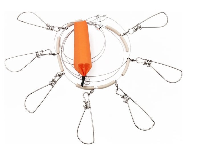 Проволока, из которой изготовлен кукан, не боится укусов щучьих зубов, что делает его долговечным и надежным аксессуаром. Карабины на кукане закреплены при помощи вертлюгов на определенном расстоянии, что обеспечивает удобство в использовании. Силиконовые трубочки используются в качестве разграничителей, чтобы сохранить трофеи в хорошем состоянии во время перевозки.