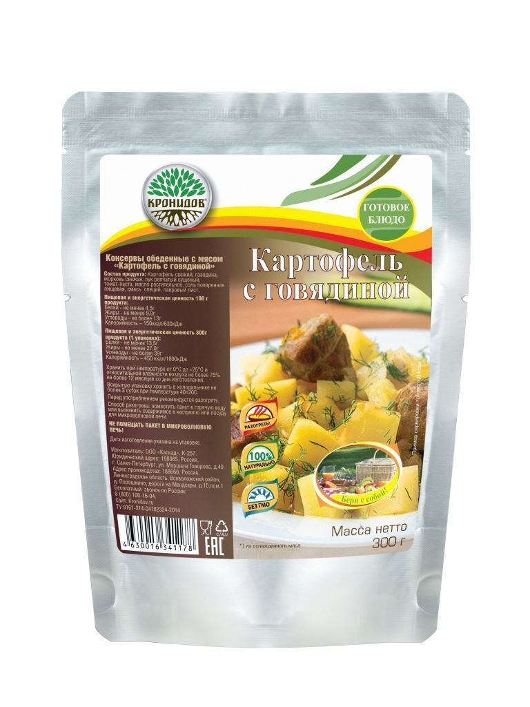 Состав: картофель свежий, говядина, морковь свежая, лук репчатый сушеный, томатная паста, масло растительное, соль поваренная пищевая, смесь специй, лавровый лист.