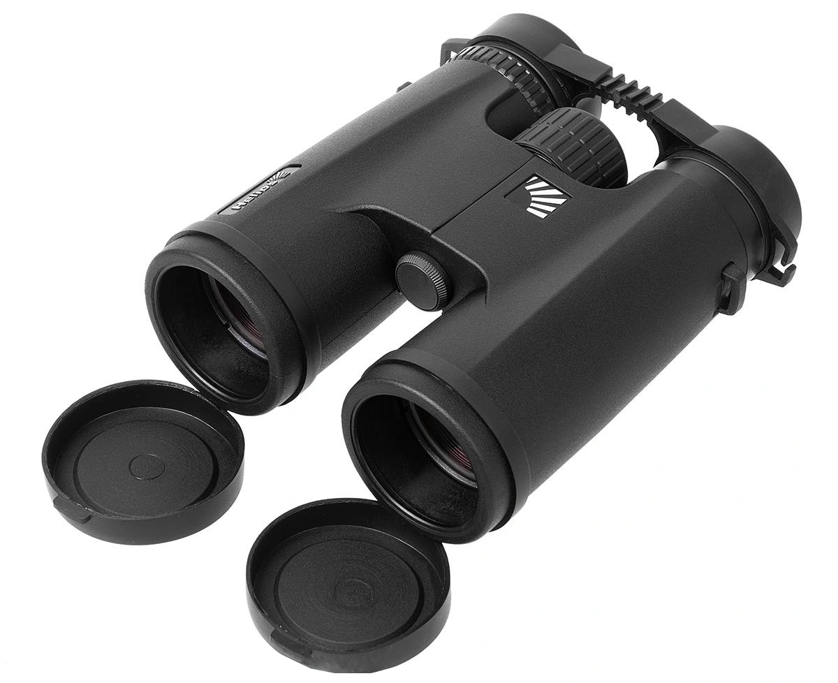 У бинокля большая площадь края с противоскользящей зубчатой поверхностью сбоку, окуляр диаметром 20 мм с линзой объектива диаметром 42 мм, поверхность всех линз покрыта широкополосной антибликовой пленкой.